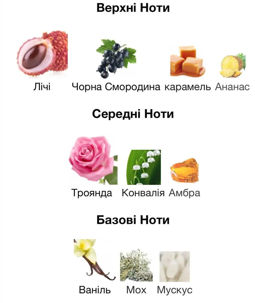 - Базові ноти: ваніль, мускус, мох