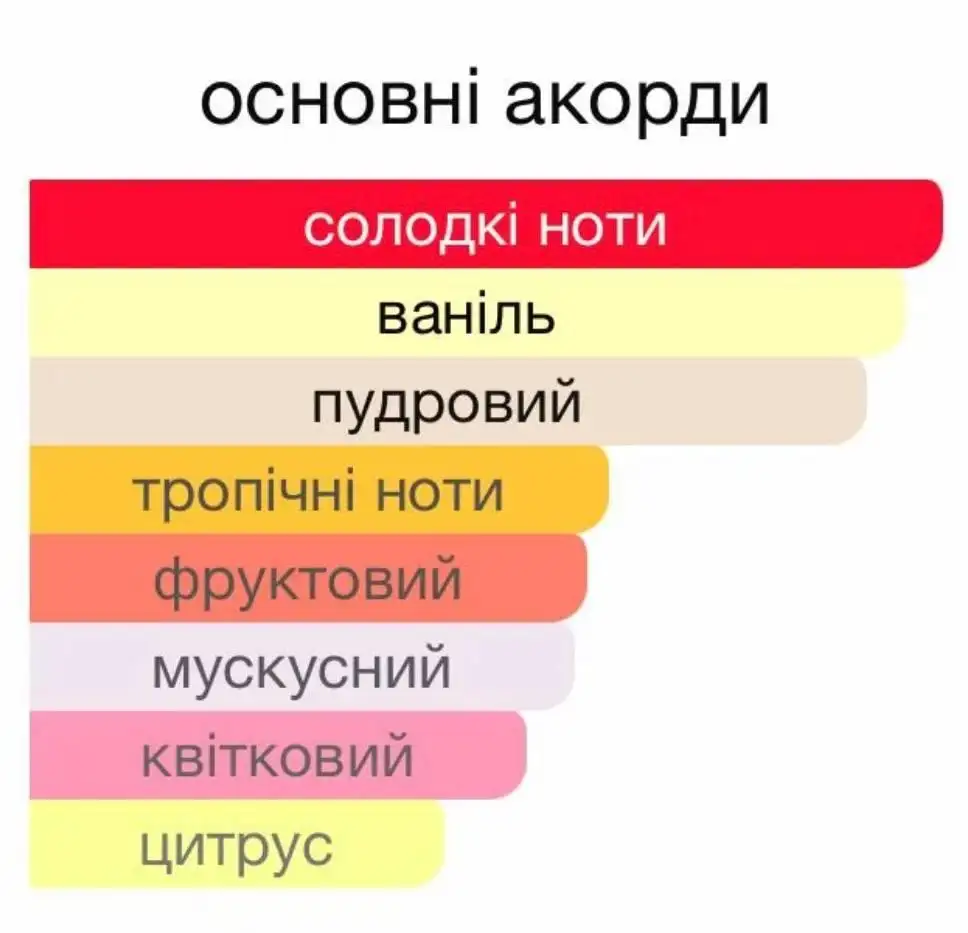 - Серцеві ноти: тропічні фрукти, гурманські акорди