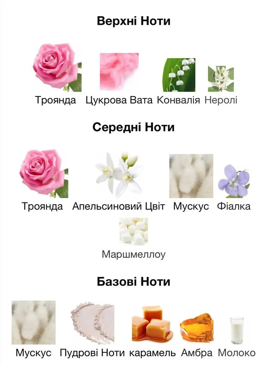 • Верхні ноти: конвалія, цукрова вата, троянда, неролі