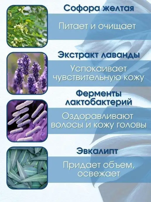 - Екстракт софори запобігає випаданню волосся і сприяє його росту, знижує температуру шкіри голови, зволожує.